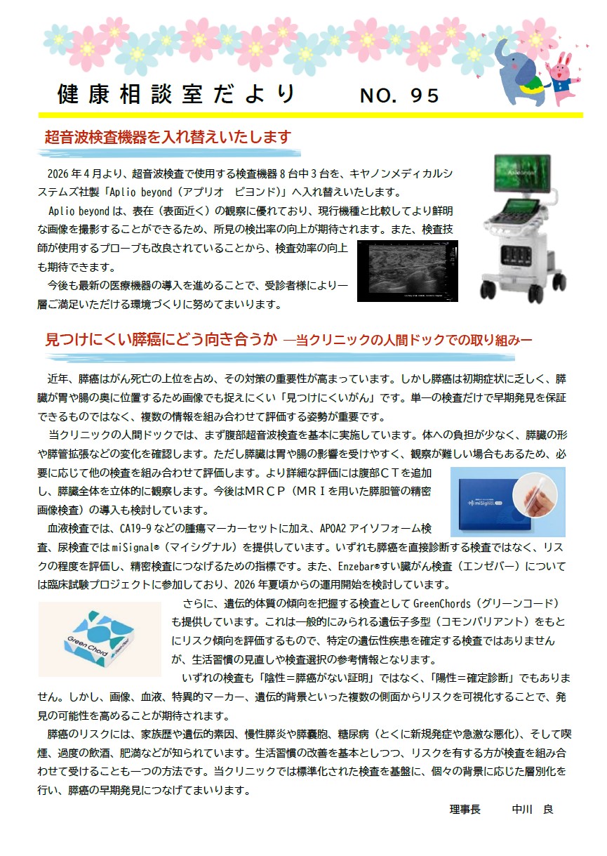 第95号 健康相談室だより 超音波検査機器を入れ替えいたします/見つけにくい膵癌にどう向き合うか/IPMN(膵管内乳頭粘液性腫瘍)とは?